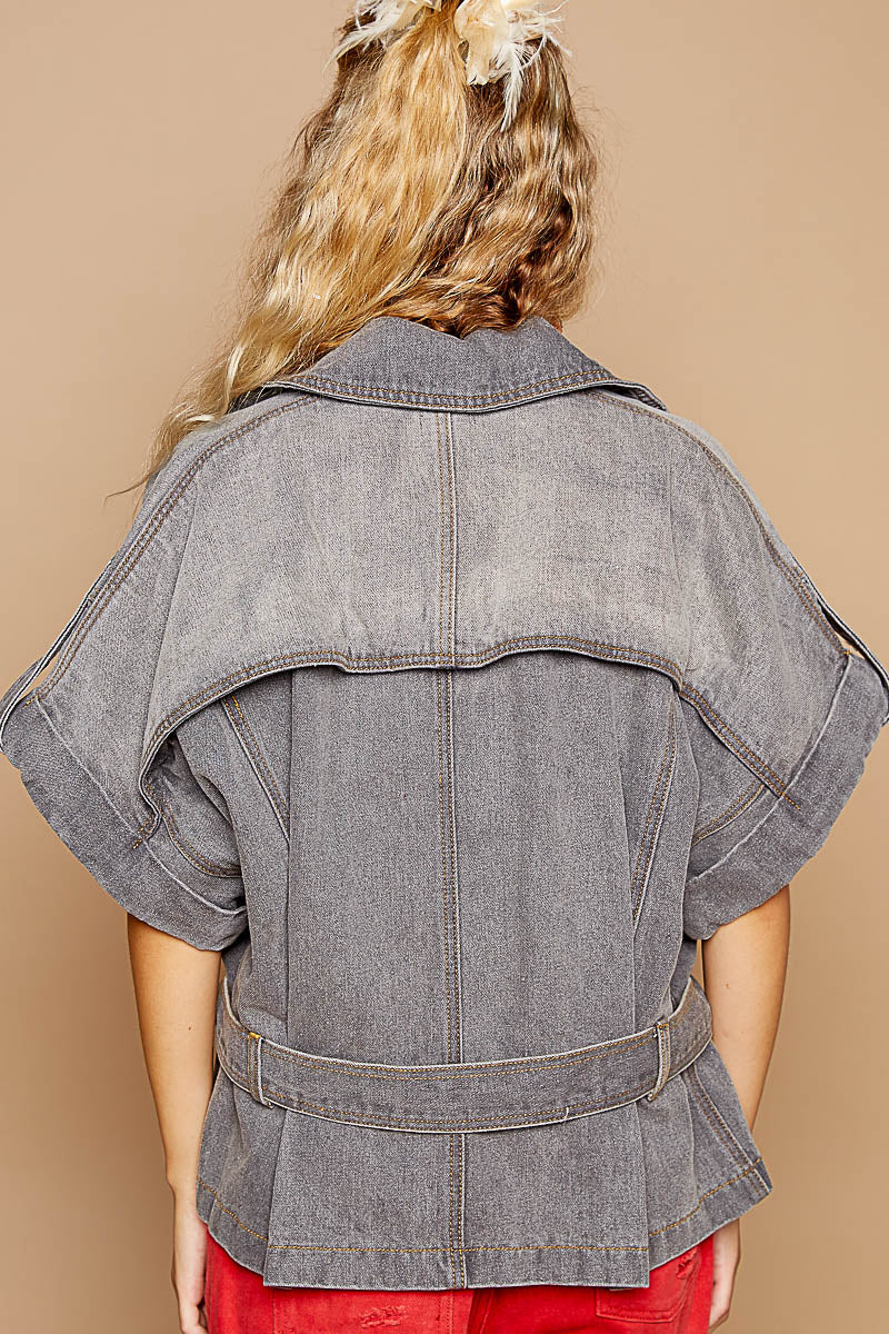 Be effortlessly cool in our Belted Denim Moto Jacket! Made with washed black denim, this motorcycle jacket features short sleeves and dropped shoulders with wide rolled sleeves and snap button closure. The asymmetrical zipper adds an edgy touch. Complete the look with the waist belt for a flattering silhouette.