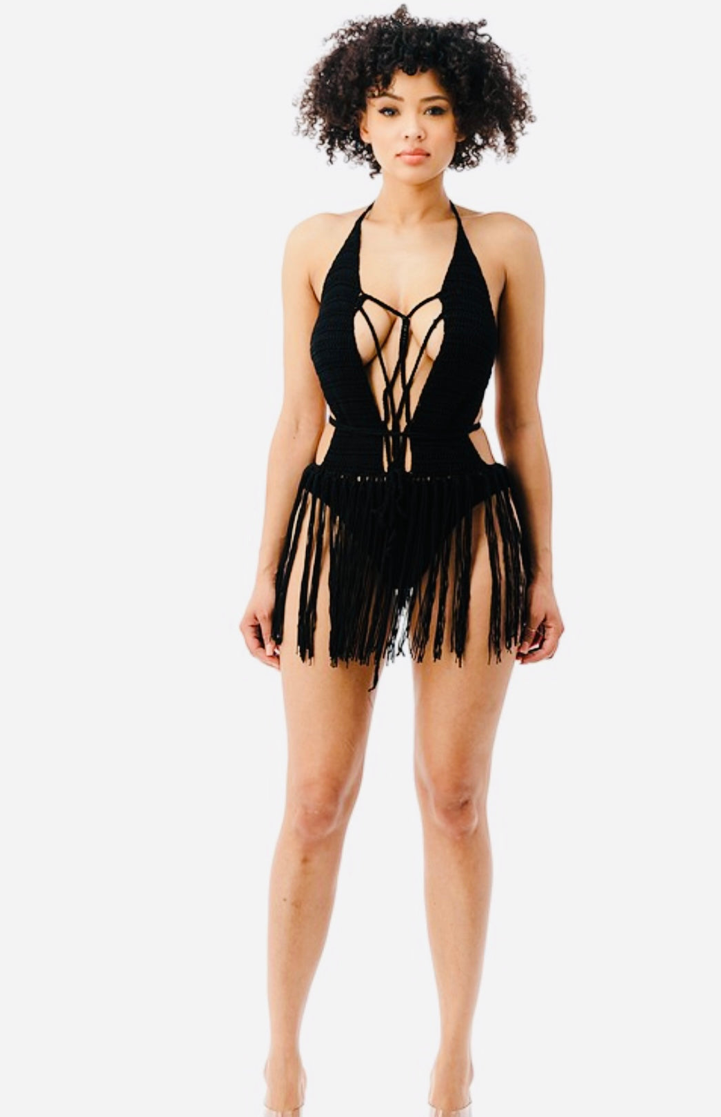 Effortlessly transition from the beach to the bar in our black crochet bikini dress! This one piece features a back tie for the perfect fit, a trendy fringe bottom, and a stretchy material for comfort. The tie front adds a touch of femininity to this versatile dress. Make a statement in style!