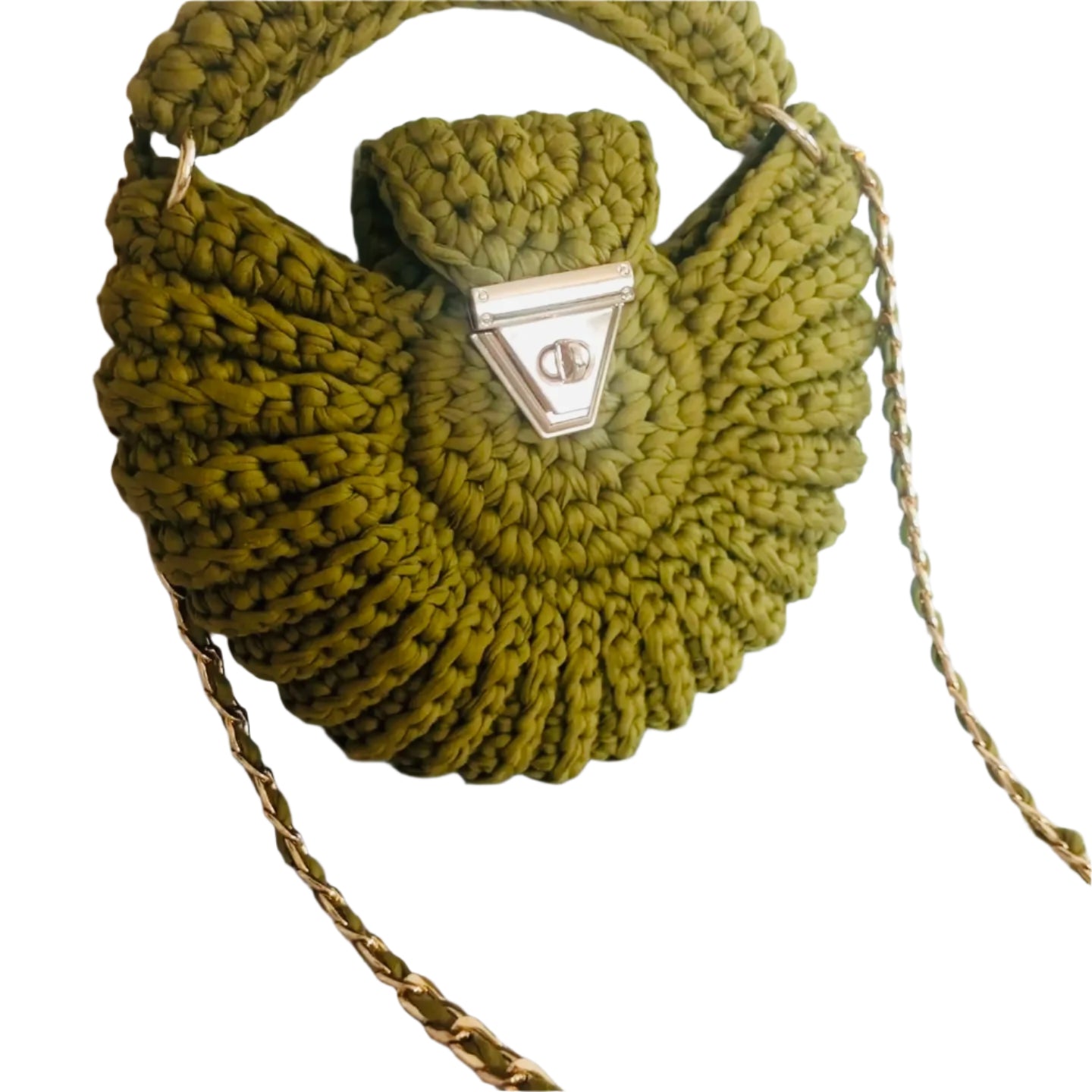 Elevate your style with our stunning crochet round bag! This purse features a round shape, front fold-over closure with a sleek gold clasp, and a luxurious knitted handle. Carry it with ease using the long chain purse strap and add a touch of elegance to any outfit.
