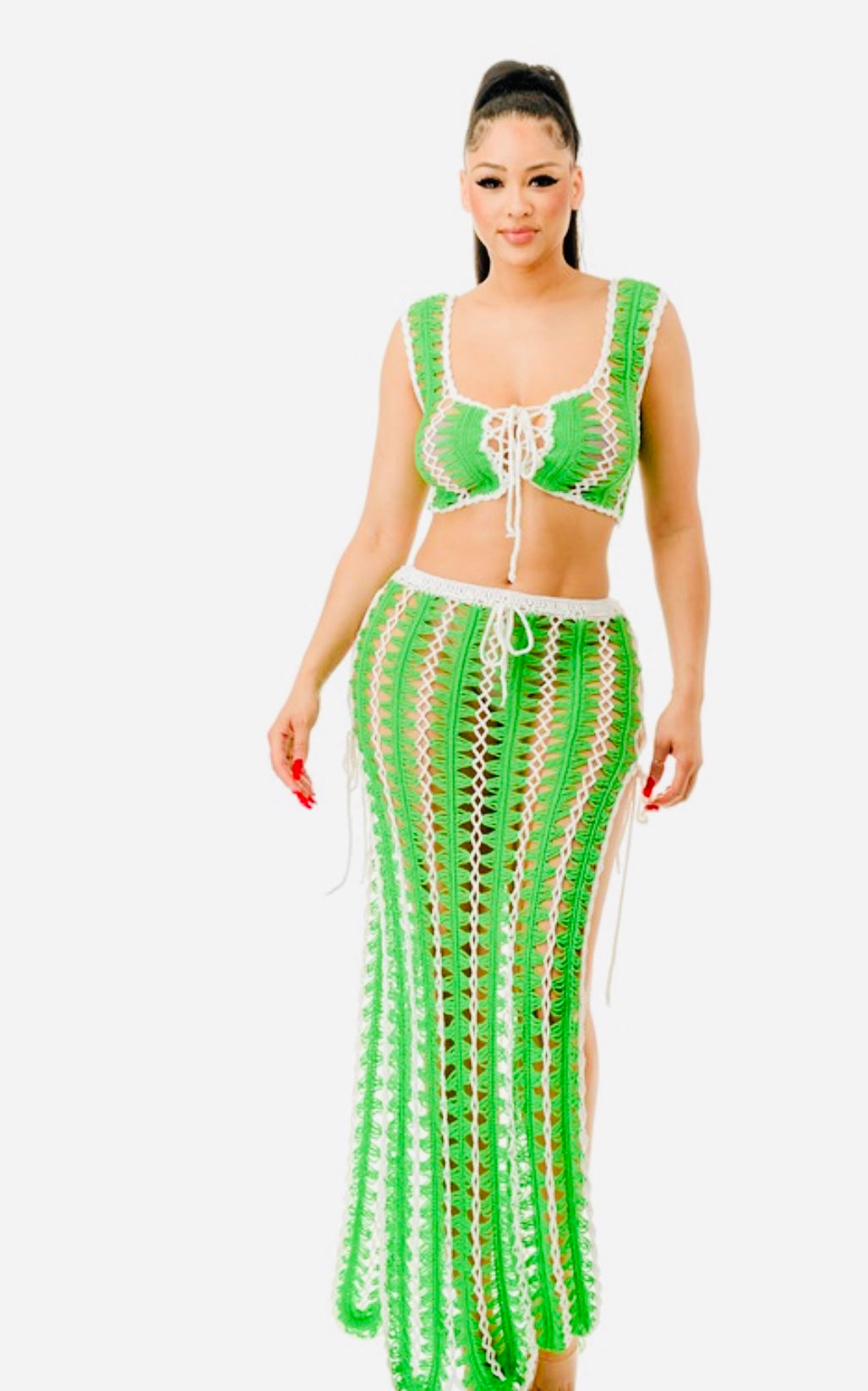 Embrace beachy vibes with our crochet skirt set! Made with stretchy fabric, this green and white set effortlessly covers up while adding a touch of flirtiness with lace-up details on the sides and front. Perfect for a day at the beach or a summer festival. Get ready to turn heads!