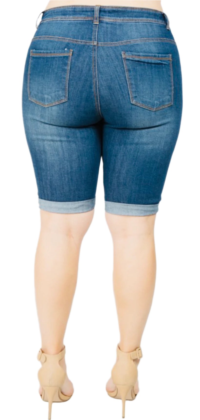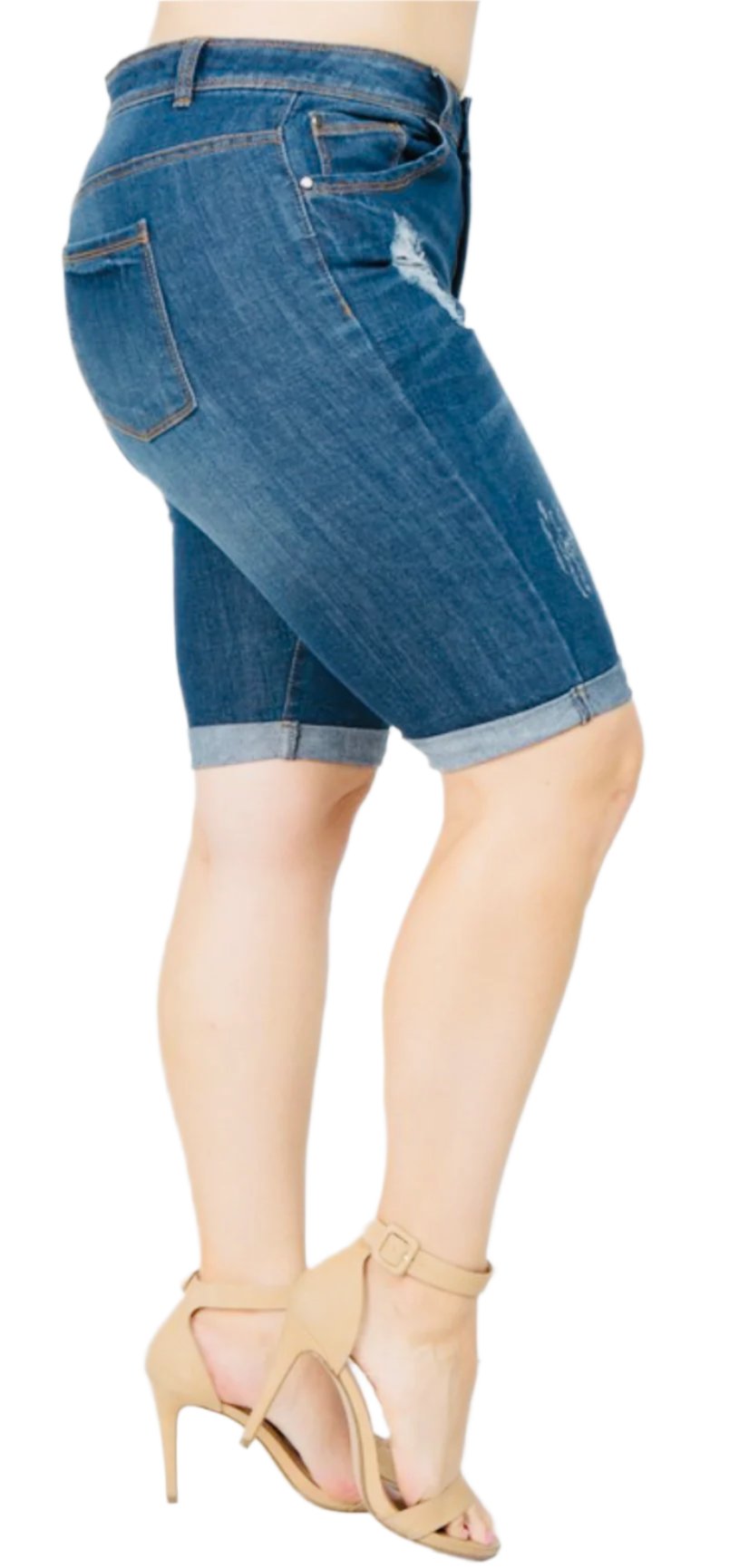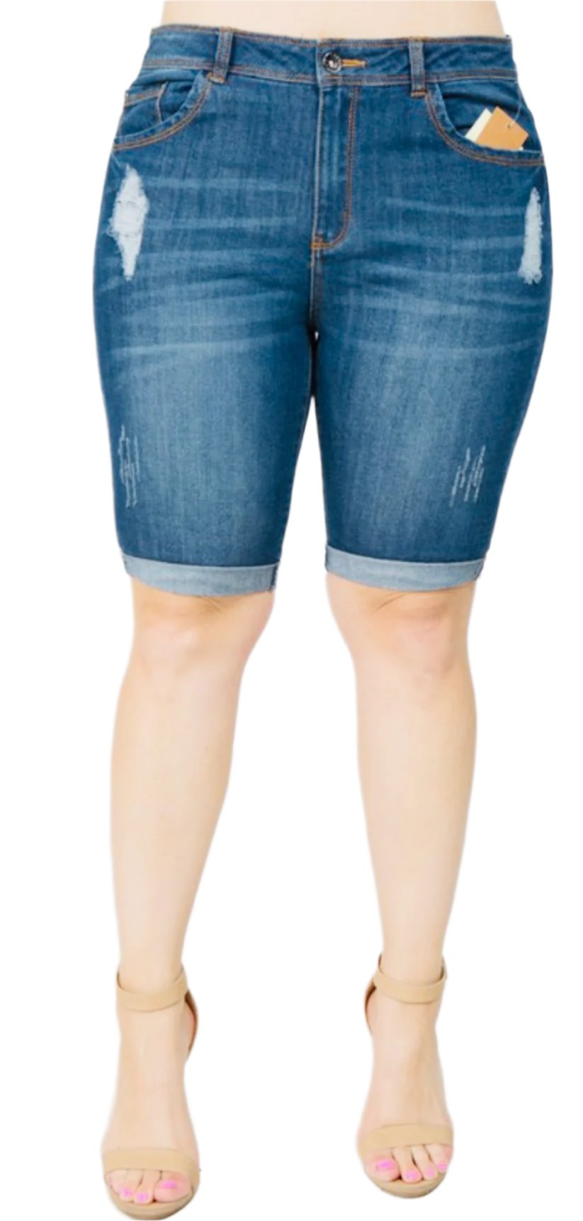 Upgrade your fall wardrobe with our dark blue cuffed bermuda shorts! Made with stretchy fabric for ultimate comfort, these shorts feature front and back pockets for convenience. The distressed design adds a trendy touch to your outfit. Look stylish and feel confident in these versatile shorts. Perfect with a pair of boots!