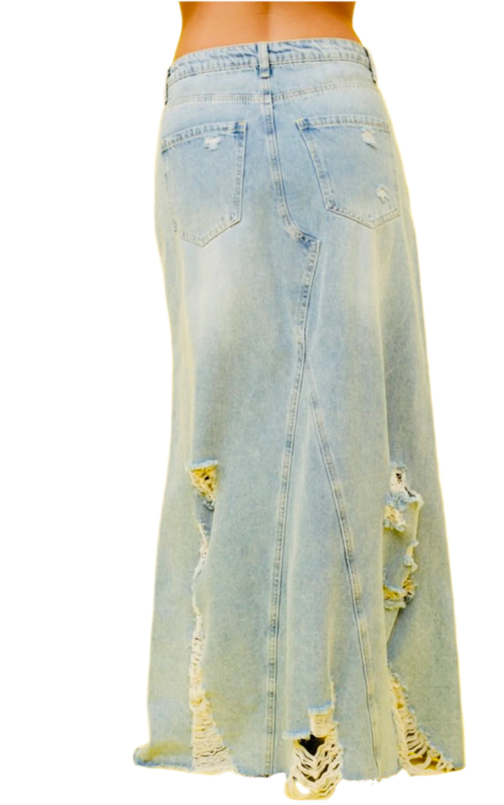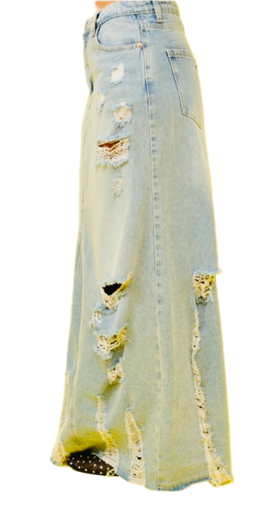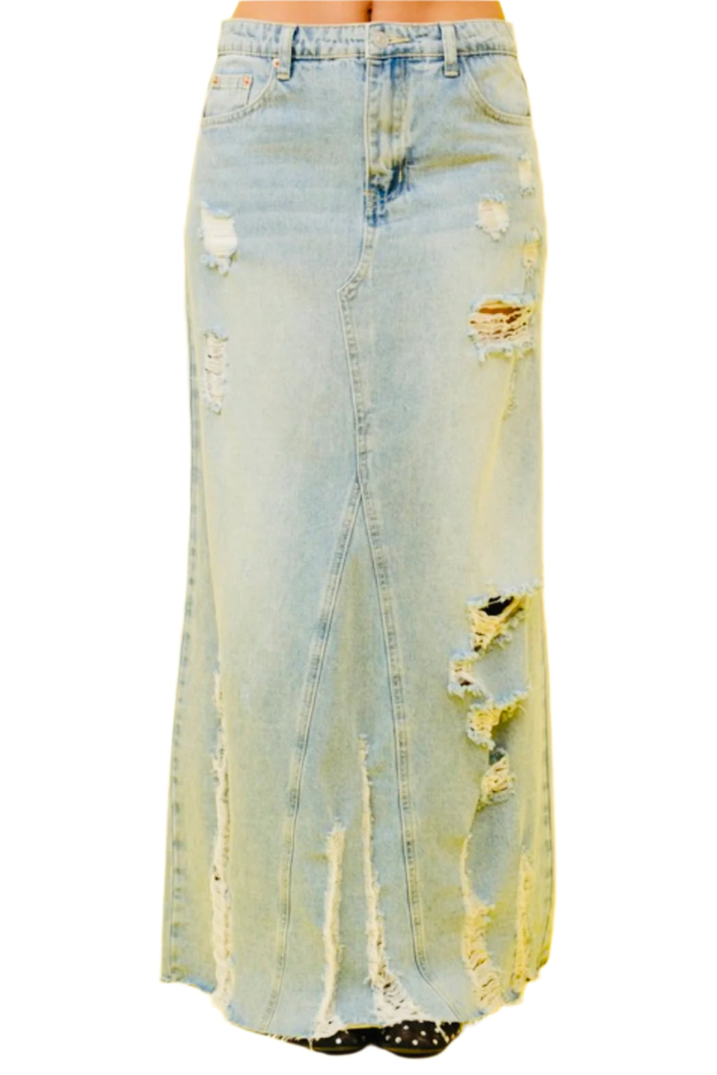 This medium denim maxi skirt with distressed details and front/back pockets is perfect for versatile and stylish outfits. It offers both comfort and functionality, making it a must-have in your wardrobe. Ditch the uncomfortable and impractical skirts, and upgrade to this denim maxi skirt for a fashionable yet practical look!