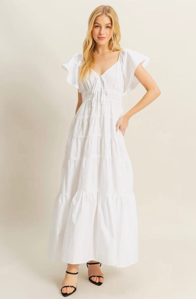 Embrace effortless elegance with the “En blanc” maxi dress. This floor-length white dress features flutter sleeves and a flattering elastic waist for comfort and style. Its tiered ruffled bottom adds playful movement, while the open back and tie front create a chic, breezy look. Practical pockets and a convenient pull-over design make it perfect for any occasion where you want to feel both relaxed and radiant.