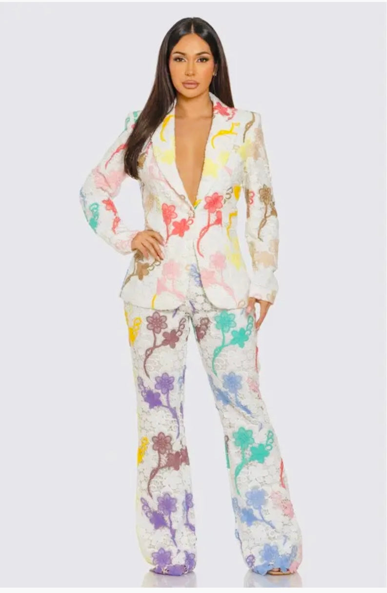 Elevate your wardrobe with this stunning floral lace pants suit, featuring a delicate embroidered design that brings vibrant color to classic white fabric. The wide-leg pants offer comfort with an elastic back, while the long-sleeve jacket, lined for a smooth fit, closes elegantly with a single button. Perfect for making a confident, stylish statement at any occasion.