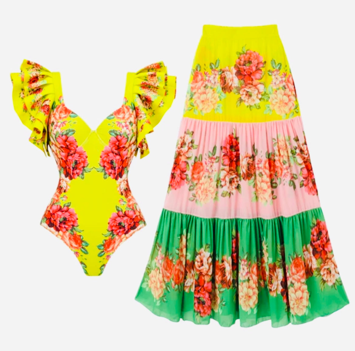 Indulge in luxury with our "Mamacita" swimsuit. Featuring a stunning floral print, the one-piece swimsuit boasts delicate ruffled sleeves for a touch of elegance. A sophisticated and exclusive look for the beach or pool.