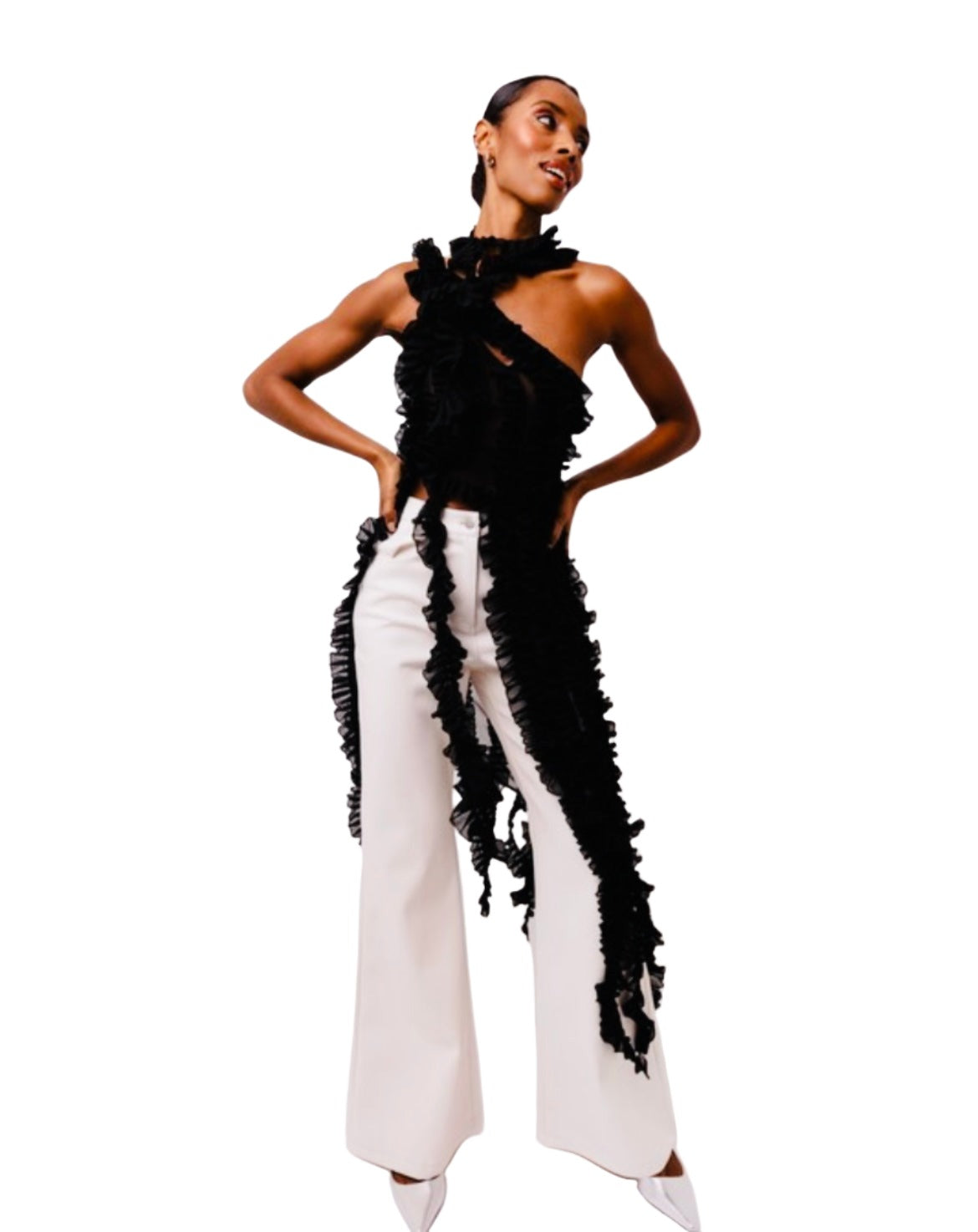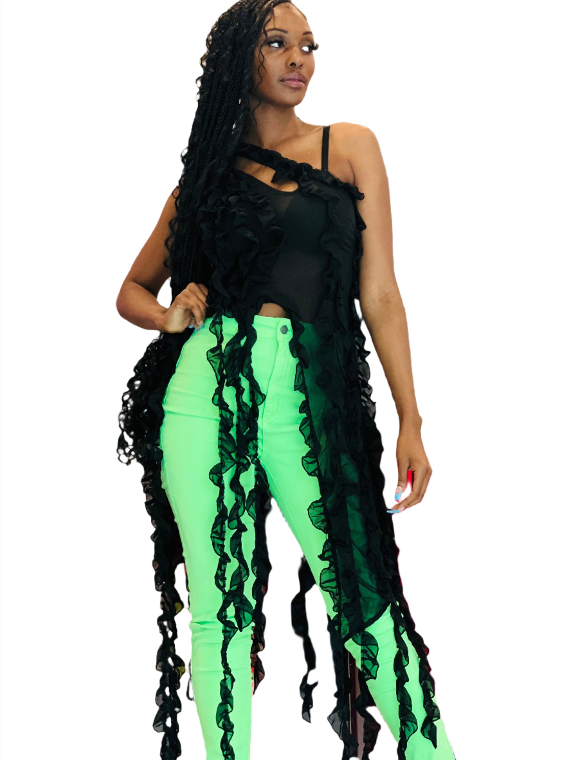 Elevate your style with our versatile ruffled chiffon top! The sheer black fabric creates a feminine and chic look, while the ruffled details add a touch of playfulness. With some stretch and the option to wear it as a top or dress, this piece is a must-have for any fashion-forward woman.